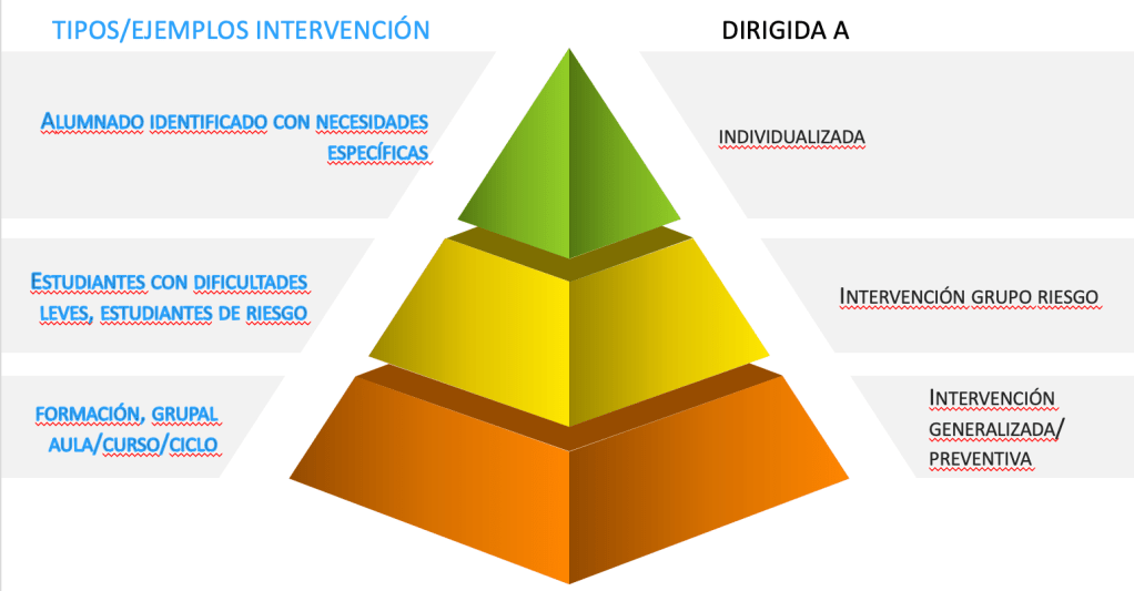 Teniendo en cuenta esta idea de la importancia de actuar de manera precoz o preventiva y con población de riesgo, y teniendo en cuenta el modelo de respuesta a la intervención (Response to intervention-RTI) implantado hace unos años en Estados Unidos, Canadá y otros países, nuestra intervención en el entorno escolar se podría hacer en 3 niveles que de manera gráfica quedaría en una pirámide en la que la base sería intervención en toda la población educativa (aula, curso, etapa educativa,…), en el segundo nivel estaría la intervención en población de riesgo y el la parte superior, la intervención individualizada. Algunas de las funciones o actuaciones que podríamos realizar serían: